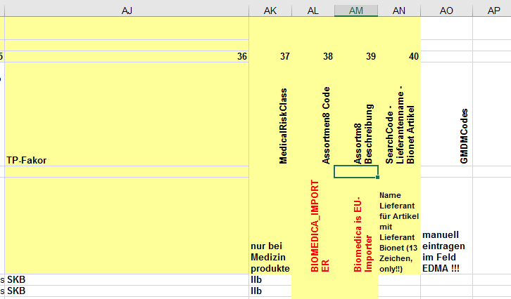 Neu sind die Spalten 38 - 40. Sortiment8 = Biomedica Importer Info, unter Assortment8 Code bitte immer den angeführten Eintrag mit Copy - Paste verwenden, unter Assortm8 Beschreibung den relevanten Eintrag ebenfalls mit Copy - Paste.